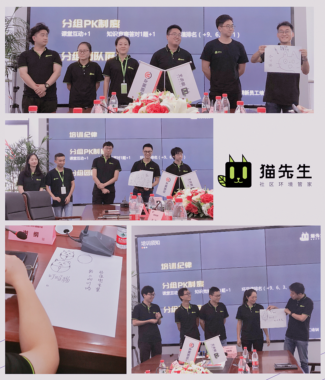 为了让新员工们打破壁垒,结识更多的同事,在正式培训之前通过简单有趣的破冰环节,让他们分组起队名、选口号来参与其中。这群年轻活力的新人们巧妙的将公司的猫文化融入到了团队的展示中——“加分猫”、“天龙猫”、“叮当猫”、“吉利猫”纷纷上台展示。大家在轻快欢乐的环境中迅速的互相了解认识。