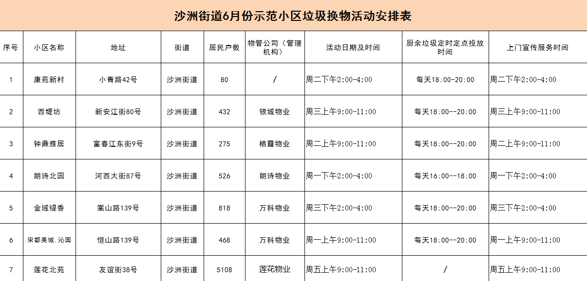 以下是沙洲街道6月份示范小区垃圾换物活动安排表,大家可以关注一下~有疑问可以在公众号后台私信猫猫咨询相关事宜喔!