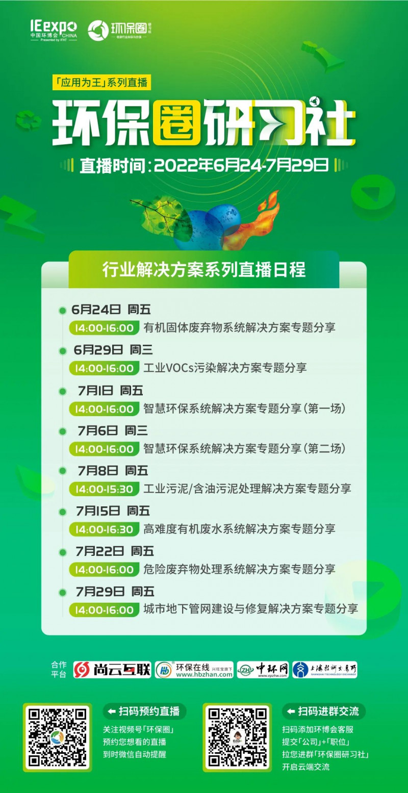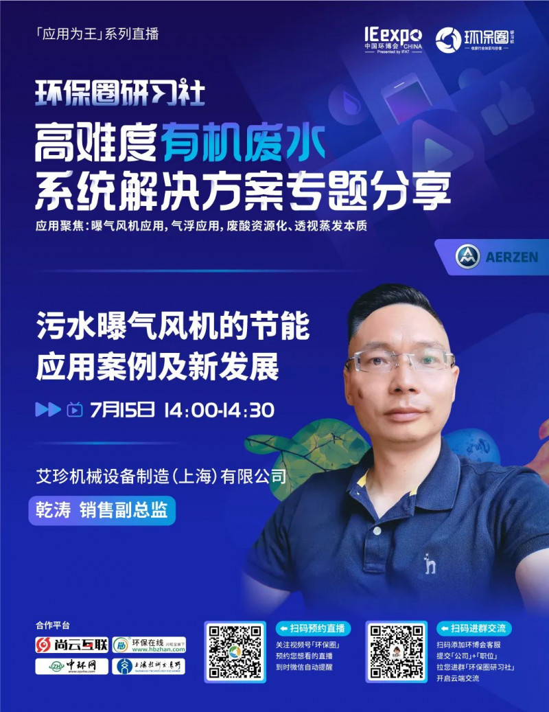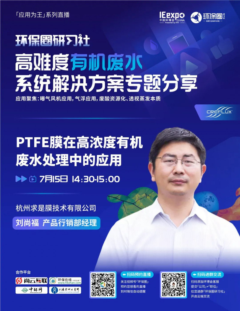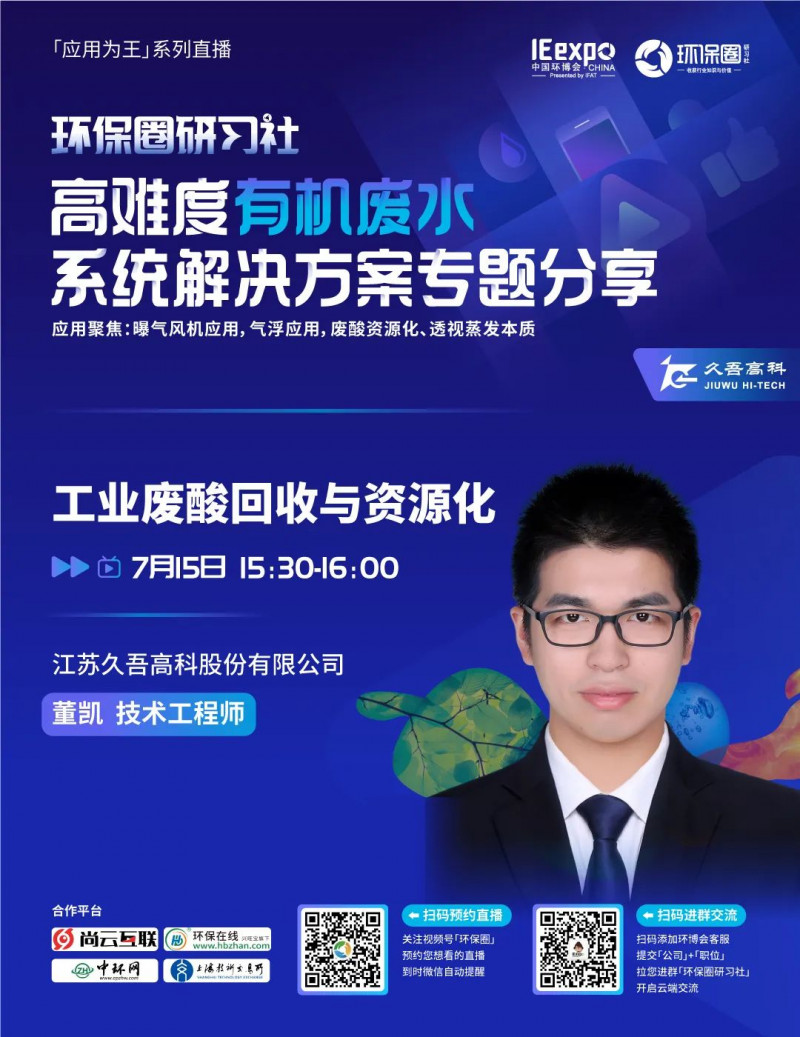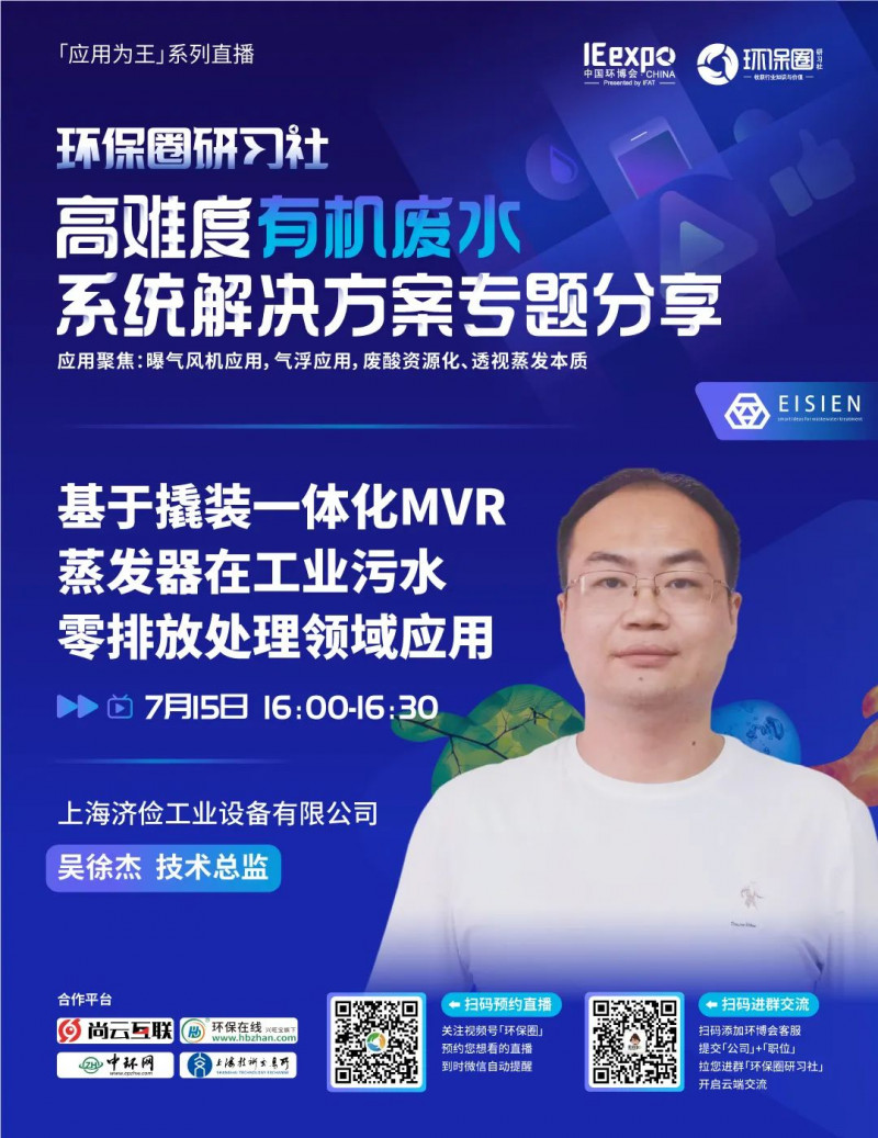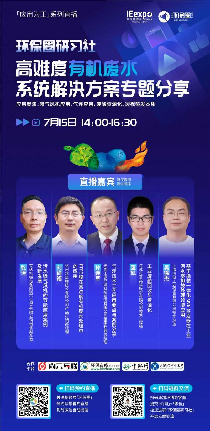 7月15日(星期五)下午14:00-16:30,环保圈研习社“应用为王”系列直播高难度有机废水系统解决方案专题分享,有幸邀请到了艾珍机械、求是膜、工源环境、久吾高科、上海济俭5家企业的技术专家做客直播间,与我们共同探讨“水环境”污染处理问题,并为大家带来高难度有机废水的节能处理、资源化利用、零排放处理等相关技术及解决方案分享。