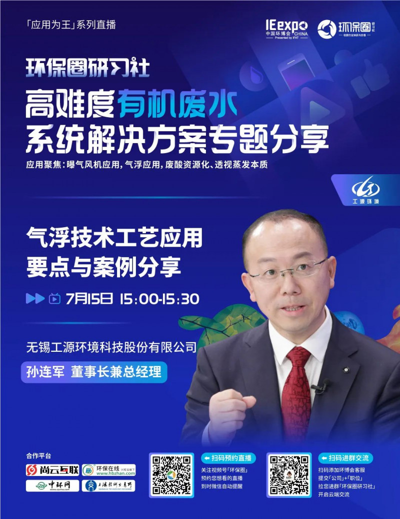 本场直播由工源环境董事长兼总经理孙连军先生——拥有近30年环保行业从业经验的环保人,亲自为您讲解气浮技术工艺应用要点,并带来大量现场应用实例展示,如果您的项目有提标除磷、河湖水体除藻治理、高浓废水(厨余垃圾、屠宰、养殖、垃圾渗滤液、化工废水等)这些困扰,更不能错过本场直播!