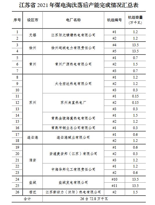 - 日前,江苏公示2021年度江苏省电力行业淘汰落后产能。2021年全省电力行业已淘汰煤电落后产能72.8万千瓦。详情如下:2021年度江苏省电力行业淘汰落后产能公示按照国家能源局《关于下达2021年煤电