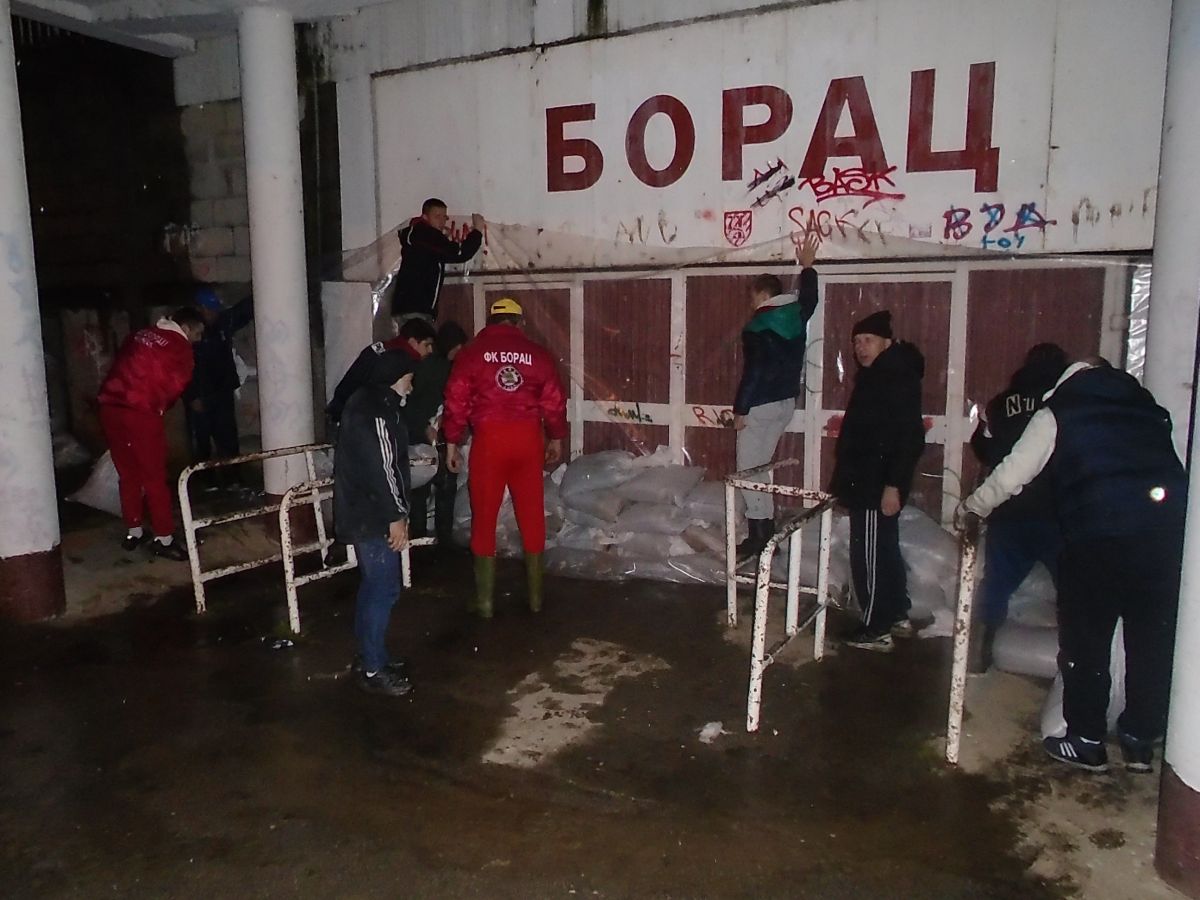 Oko dvadesetak bivših i sadašnjih igrača i trenera, navijača i prijatelja kluba se odazvalo apelu Borca da dođu na stadion i pomognu pri pravljenju zaštite od najlona i džakova sa peskom.